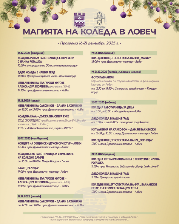В Ловеч продължава „Магията на Коледа“ с концерт, танци и детска работилница на 18 декември