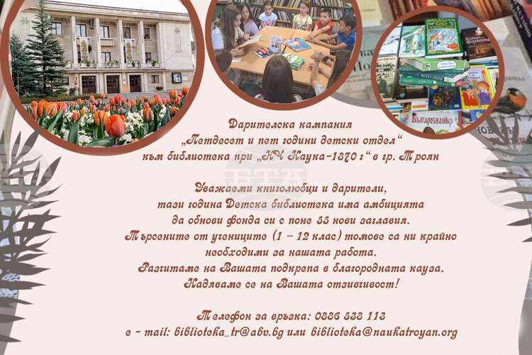 Народно читалище „Наука – 1870 г.“ в Троян започна дарителска кампания по повод 55 години от създаването на детския отдел…