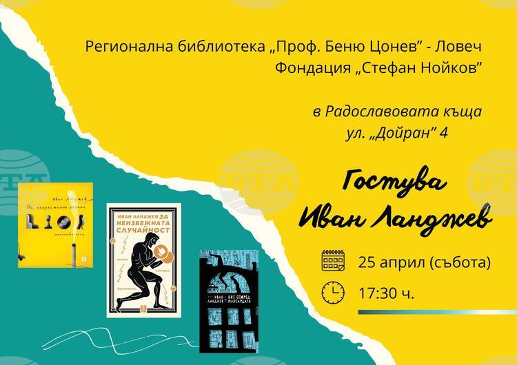 Литературна среща с поета и есеист Иван Ланджев ще се състои в събота, 25 април, в Радославовата къща в квартал „Вароша“ в Ловеч. Събитието се организира от Регионалната библиотека „Проф. Беню Цонев“ и фондация „Стефан Нойков“, съобщи Албена Йончева от библиотеката.
